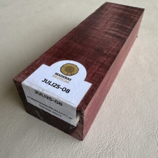 El Amaranto (Peltogyne spp.), también conocido como Purpleheart, es una madera exótica originaria de Centro y Sudamérica, reconocida por su asombroso color violeta púrpura natural, que se intensifica con el tiempo y el pulido. Su densidad aproximada es de 860 kg/m³, lo que la convierte en una madera dura, resistente y muy estable, ideal para cachas de cuchillos de alta gama.