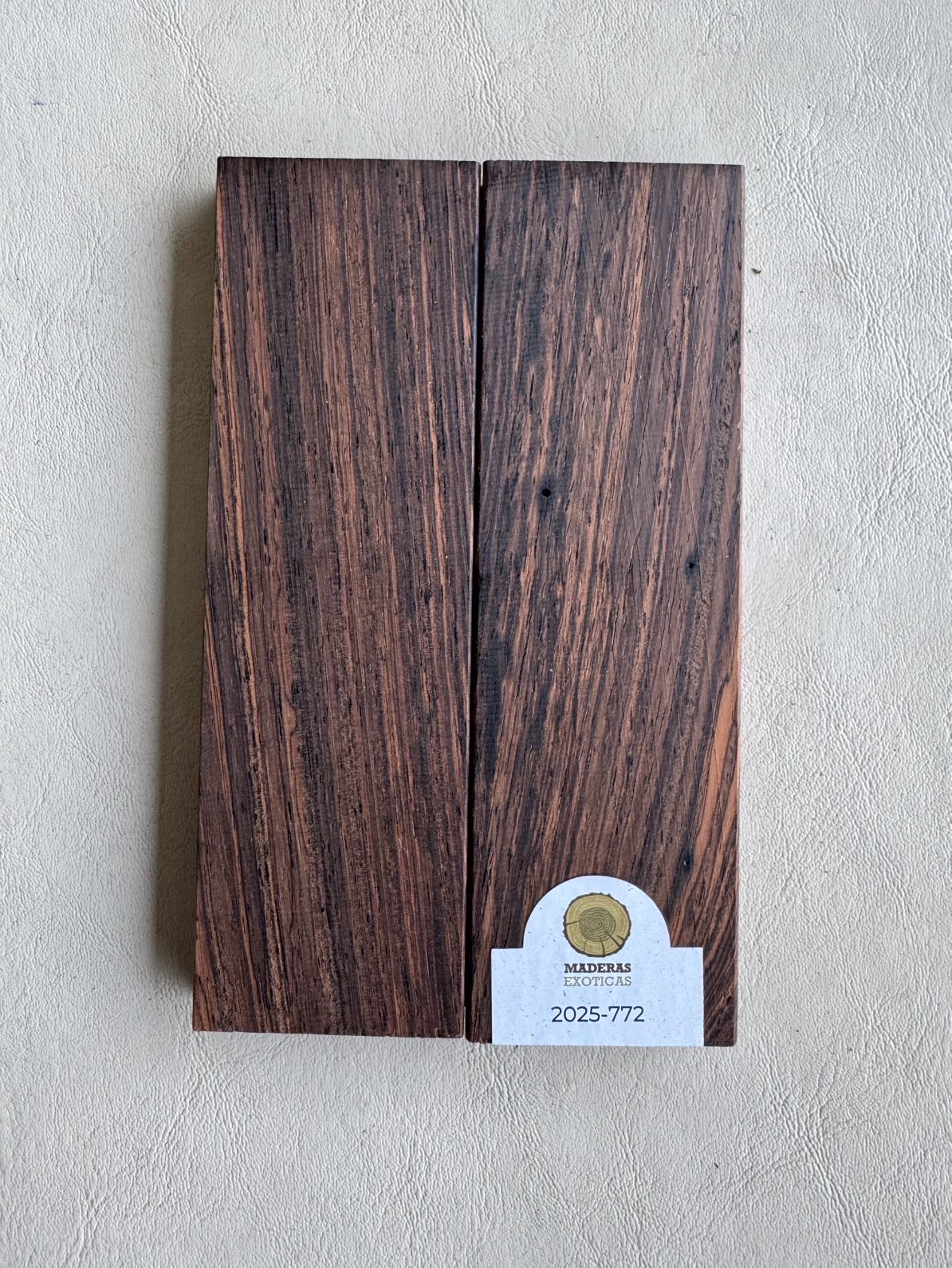 Cachas de Brazilian Rosewood para cuchillos. Madera originaria de Brasil, de altísima densidad (1.000–1.200 kg/m³), muy dura, estable y naturalmente oleosa. Su color oscuro con vetas profundas y su aroma inconfundible la convierten en una de las maderas más valoradas para piezas exclusivas. Ideal para cuchillería de lujo por su belleza, durabilidad y excelente trabajabilidad.
