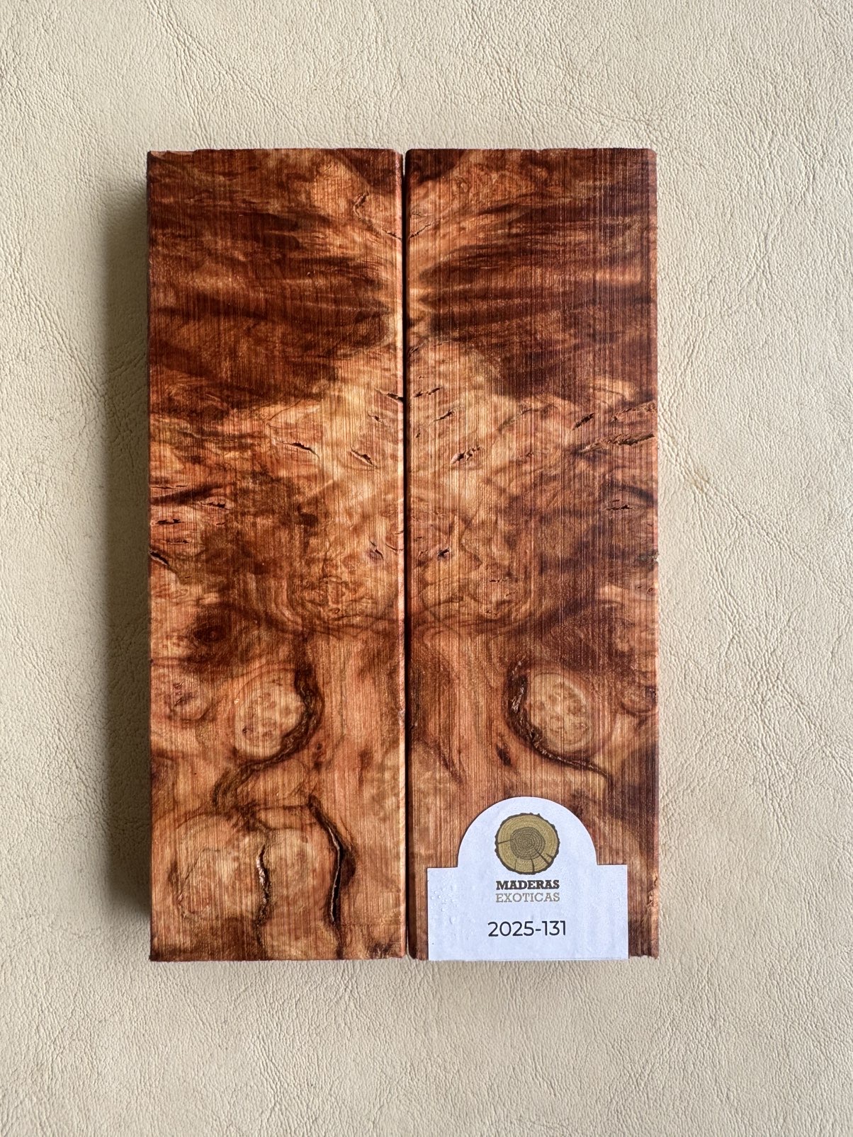 Cachas burl de Coihue (Nothofagus dombeyi) para cuchillos. Madera patagónica de densidad media (650 kg/m³), con vetas irregulares y ojos propios del burl: una deformación natural que genera dibujos únicos. Ideal para piezas exclusivas.