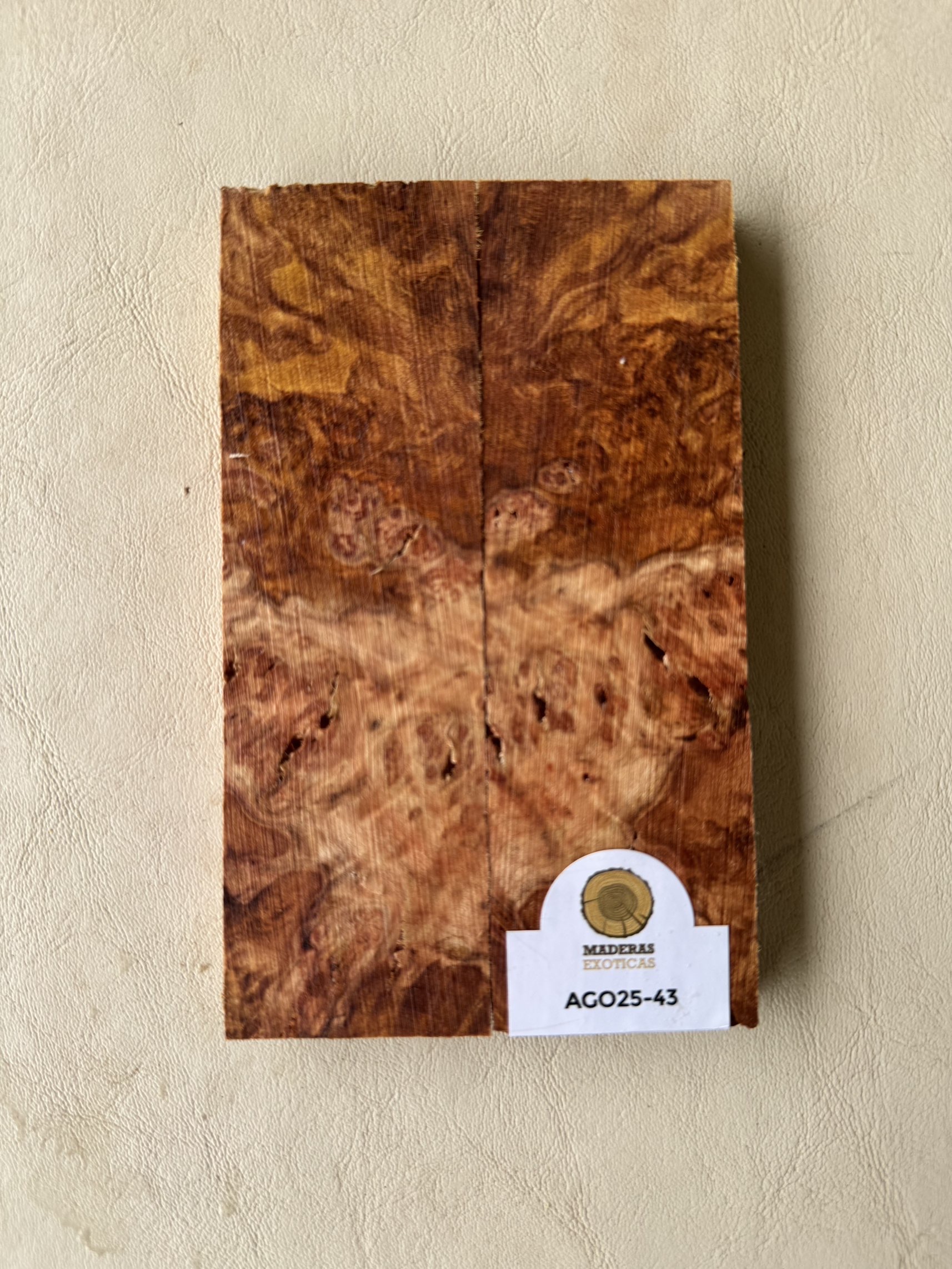Cachas de burl de coihue (Nothofagus dombeyi) para cuchillos. Madera patagónica de densidad media (650 kg/m³), con vetas irregulares y ojos propios del burl: una deformación natural que genera dibujos únicos. Ideal para piezas exclusivas.
