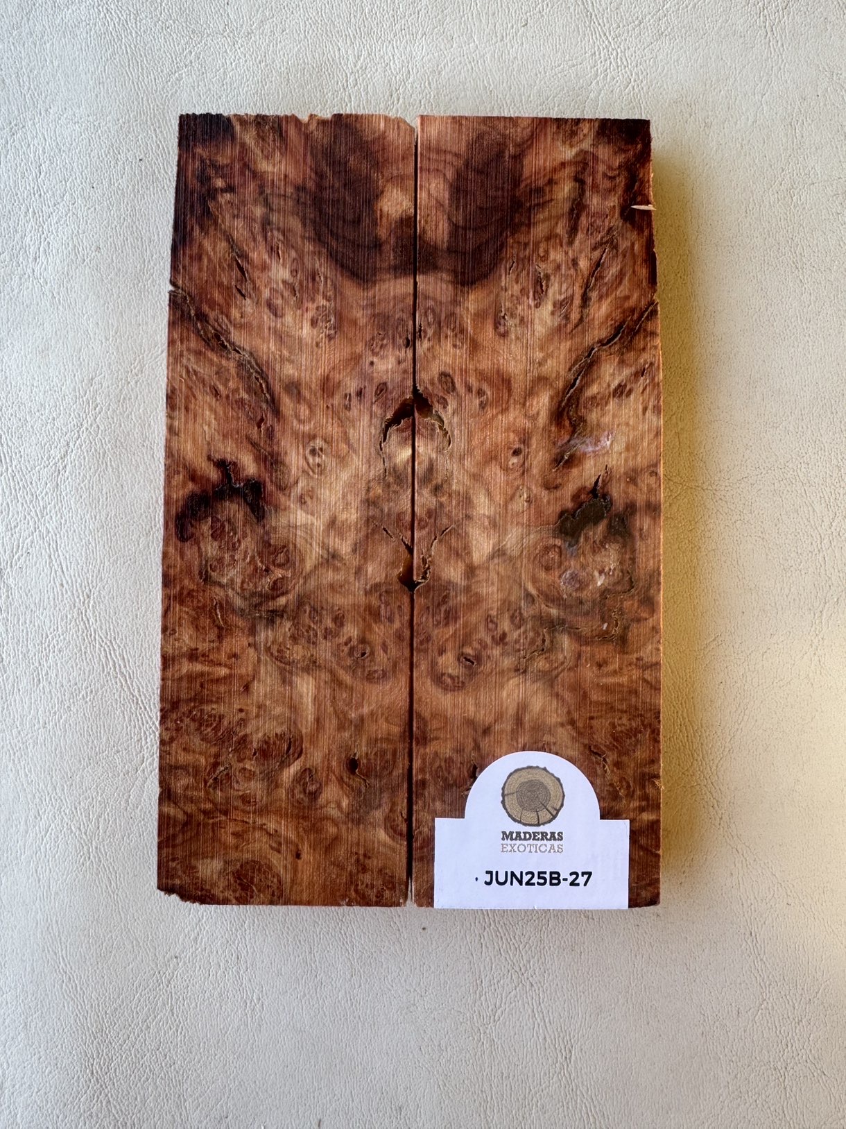 Cachas burl de Coihue (Nothofagus dombeyi) para cuchillos. Madera patagónica de densidad media (650 kg/m³), con vetas irregulares y ojos propios del burl: una deformación natural que genera dibujos únicos. Ideal para piezas exclusivas.