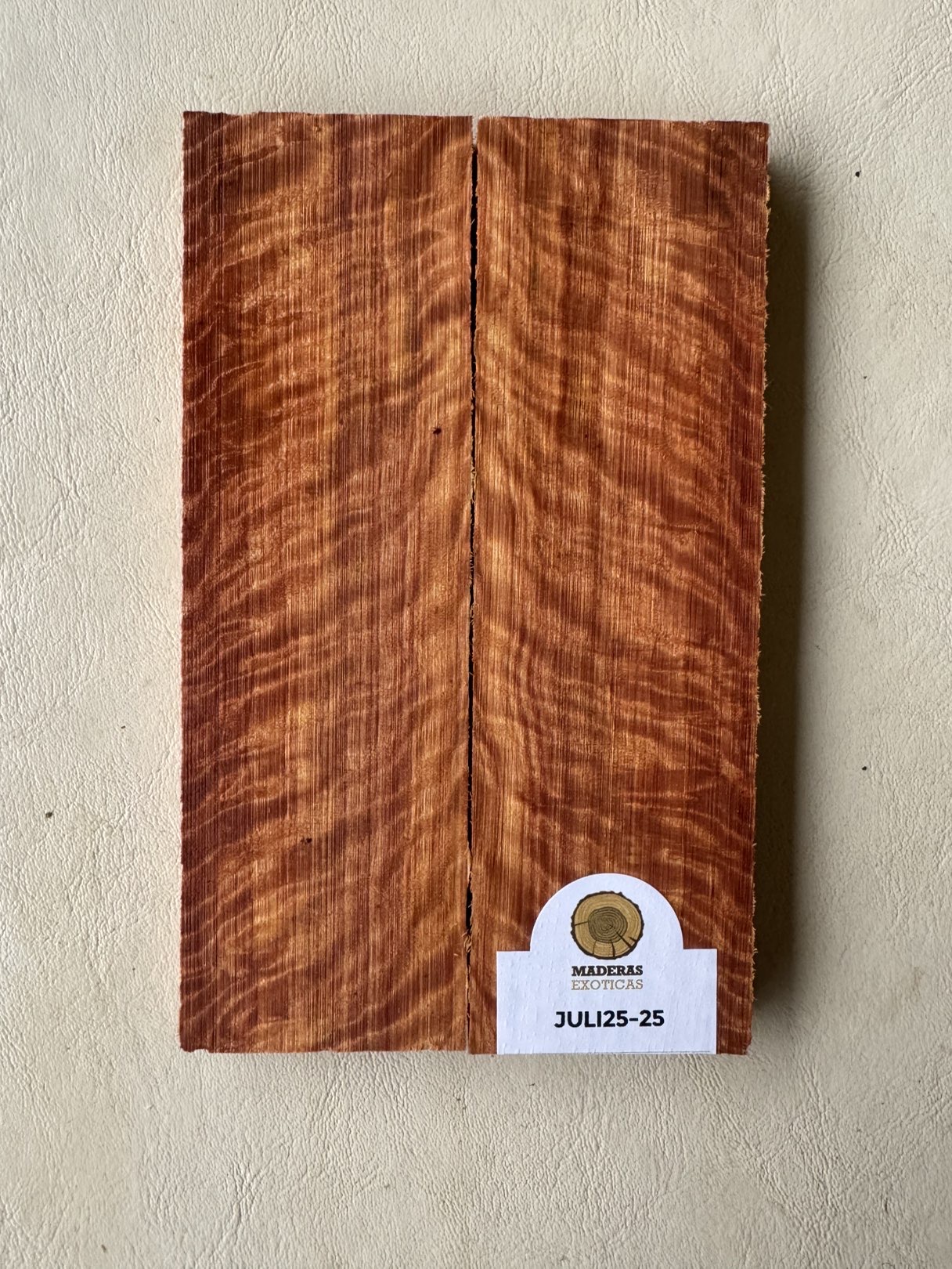 Cachas de Ciprés Flameado (Cupressus lusitanica), originarios de Centroamérica, con densidad media (~540 kg/m³). Piezas únicas con un flameado espectacular, ideales para mangos de cuchillos artesanales.