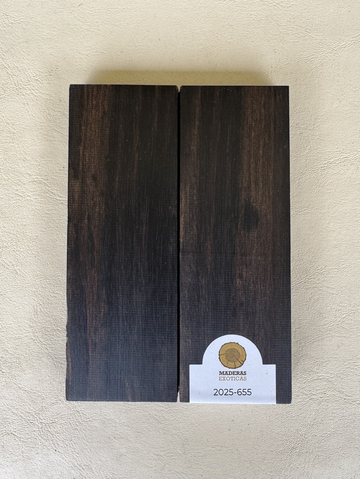 Cachas de ébano Gabón (Diospyros crassiflora), una de las maderas más exclusivas y deseadas del mundo para cuchillería de alta gama. Originaria del África ecuatorial, esta especie presenta una densidad excepcional, cercana a los 1000–1100 kg/m³, y una dureza extrema que garantiza durabilidad, resistencia al desgaste y un acabado perfectamente pulido. Su color negro profundo con vetas ocasionales la convierte en sinónimo de elegancia y distinción.