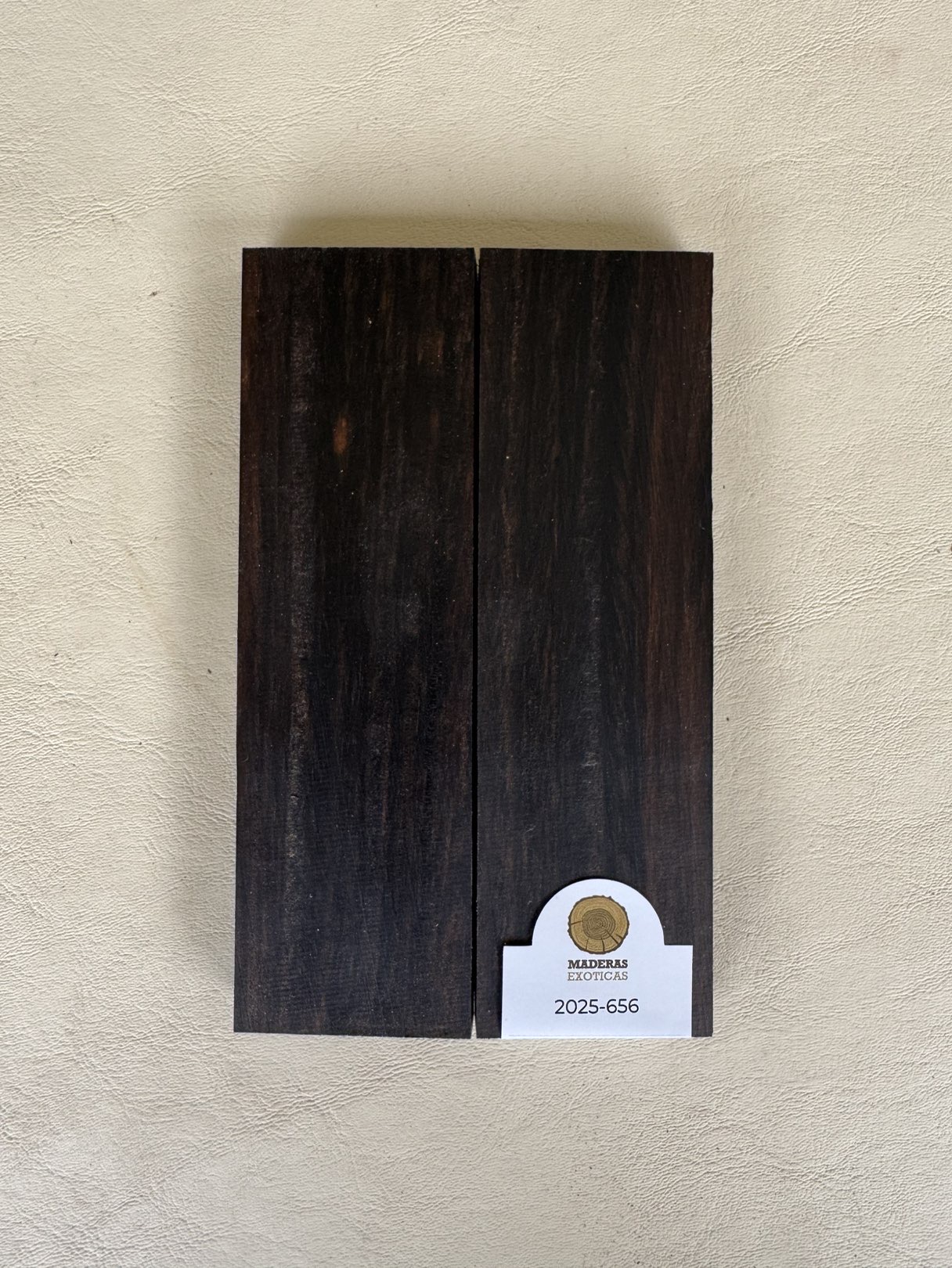 Cachas de ébano Gabón (Diospyros crassiflora), una de las maderas más exclusivas y deseadas del mundo para cuchillería de alta gama. Originaria del África ecuatorial, esta especie presenta una densidad excepcional, cercana a los 1000–1100 kg/m³, y una dureza extrema que garantiza durabilidad, resistencia al desgaste y un acabado perfectamente pulido. Su color negro profundo con vetas ocasionales la convierte en sinónimo de elegancia y distinción.
