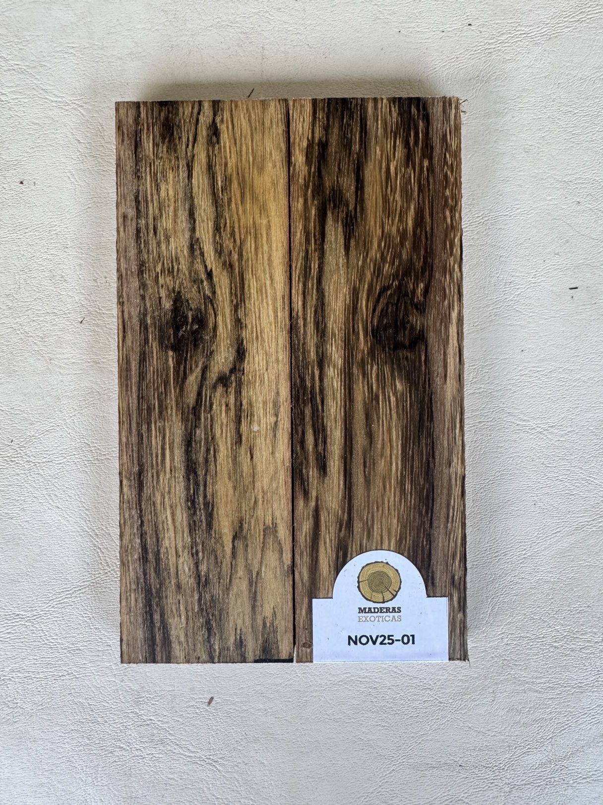 Cachas de Guayubira (Patagonula americana), madera semidura de ± 800 kg/m³, originaria del noreste argentino y Paraguay. Destaca por su veta contrastada, excelente trabajabilidad y buena resistencia, ideal para mangos elegantes y duraderos.
