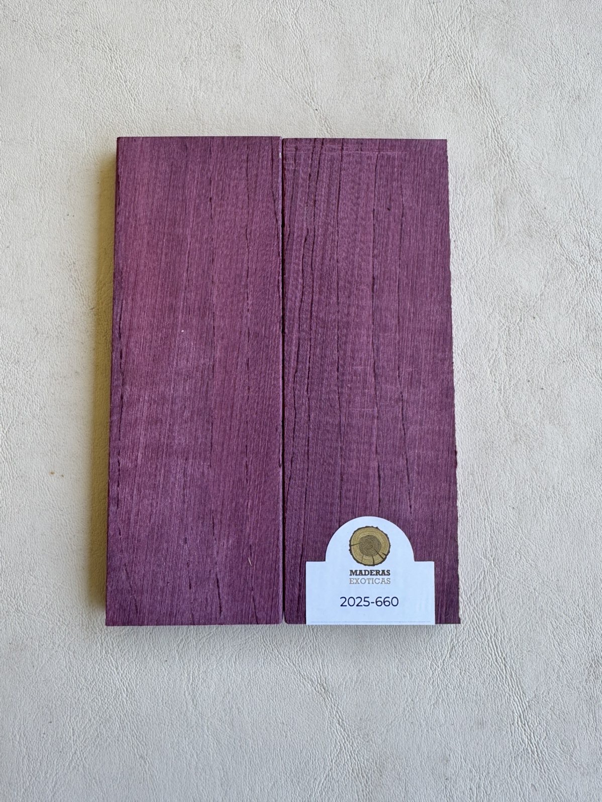 El Amaranto (Peltogyne spp.), también conocido como Purpleheart, es una madera exótica originaria de Centro y Sudamérica, reconocida por su asombroso color violeta púrpura natural, que se intensifica con el tiempo y el pulido. Su densidad aproximada es de 860 kg/m³, lo que la convierte en una madera dura, resistente y muy estable, ideal para cachas de cuchillos de alta gama.
