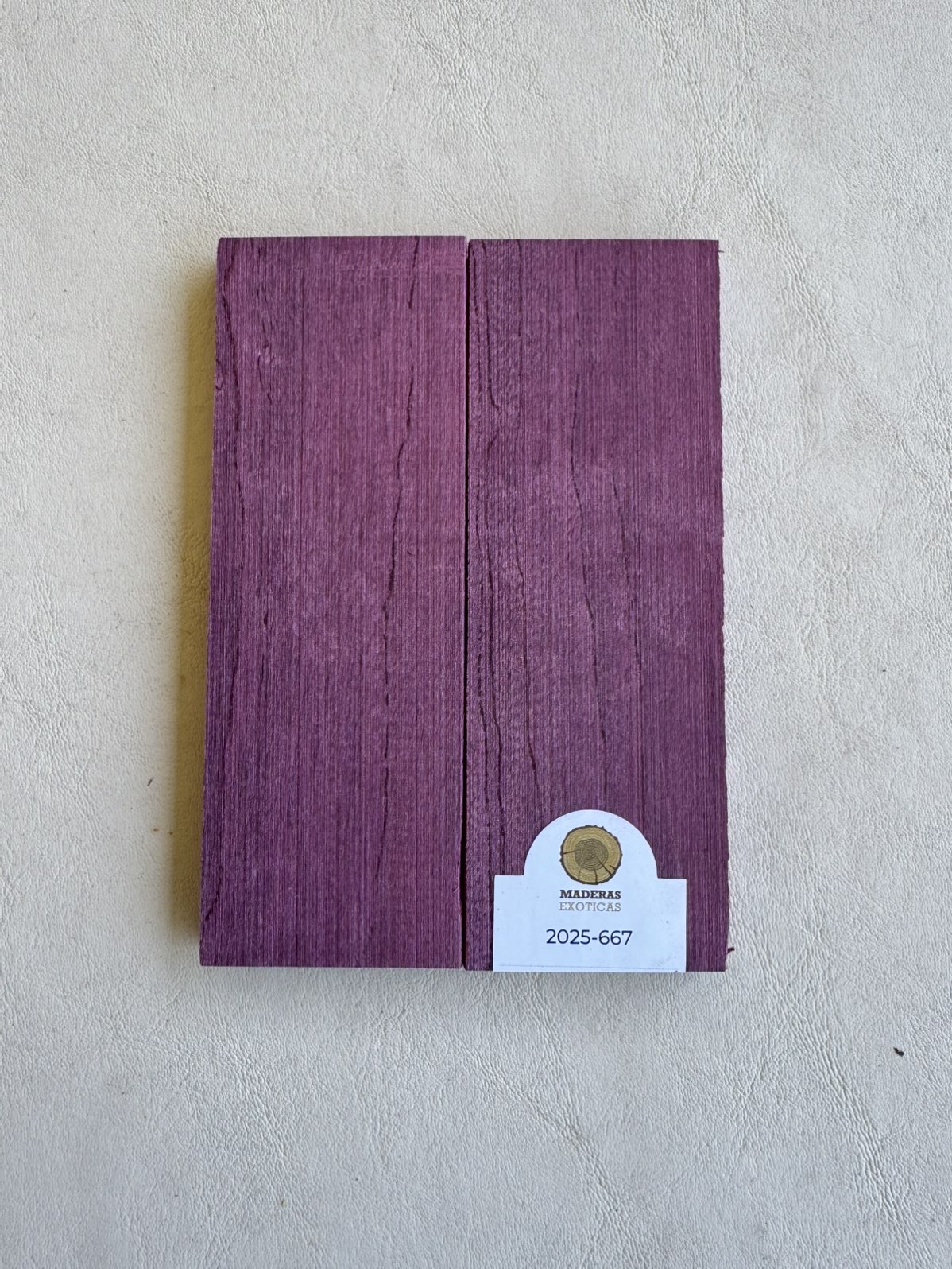 El Amaranto (Peltogyne spp.), también conocido como Purpleheart, es una madera exótica originaria de Centro y Sudamérica, reconocida por su asombroso color violeta púrpura natural, que se intensifica con el tiempo y el pulido. Su densidad aproximada es de 860 kg/m³, lo que la convierte en una madera dura, resistente y muy estable, ideal para cachas de cuchillos de alta gama.