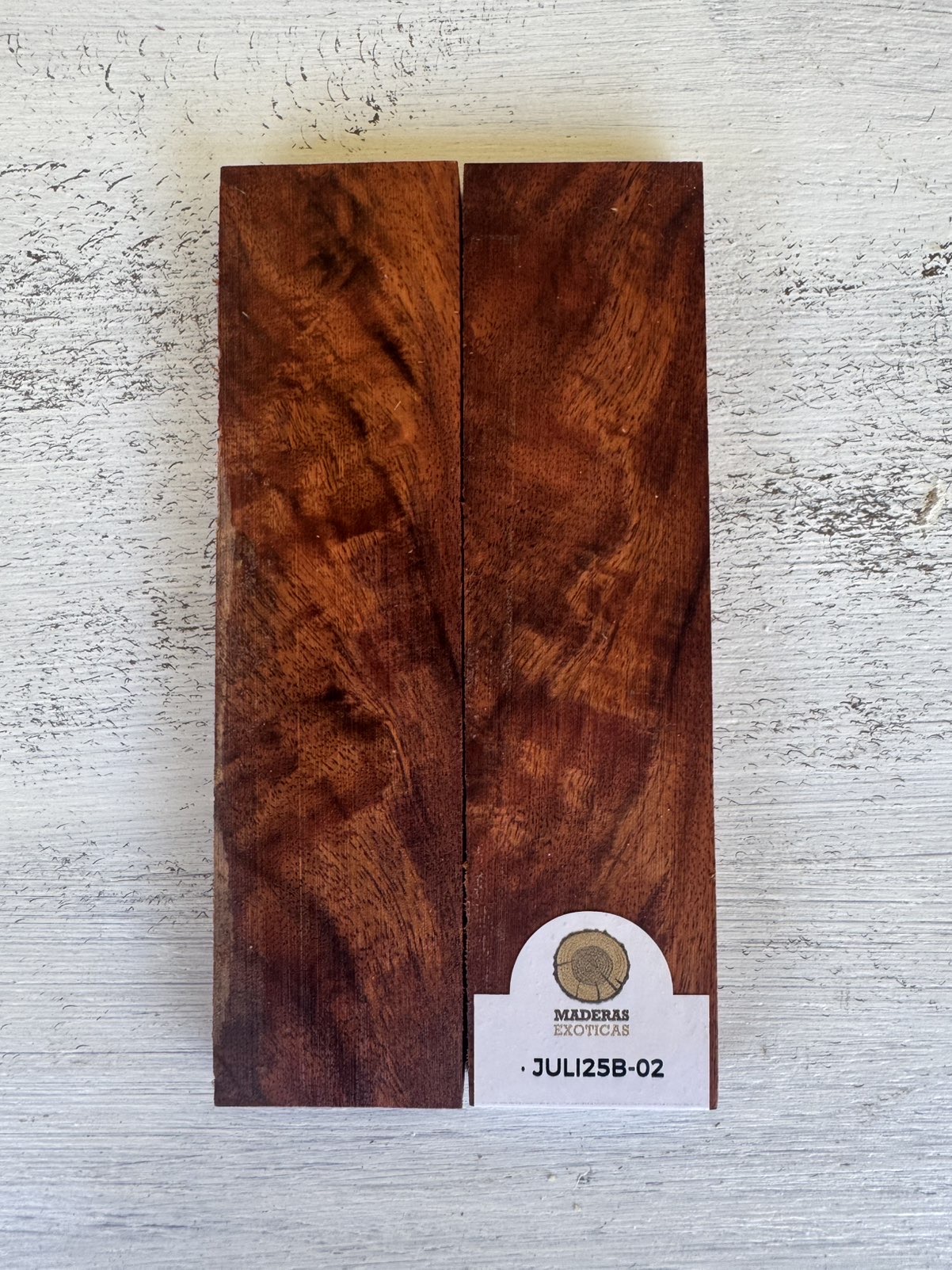 Cachas de raiz de Algarrobo (Prosopis spp.) para cuchillos. Madera nativa de Sudamérica, con densidad media-alta (aprox. 850 kg/m³), muy dura, estable y resistente. El burl o “nudo” del algarrobo genera dibujos únicos, de alto valor estético, ideales para piezas artesanales y de colección. Excelente trabajabilidad y acabado natural con brillo.