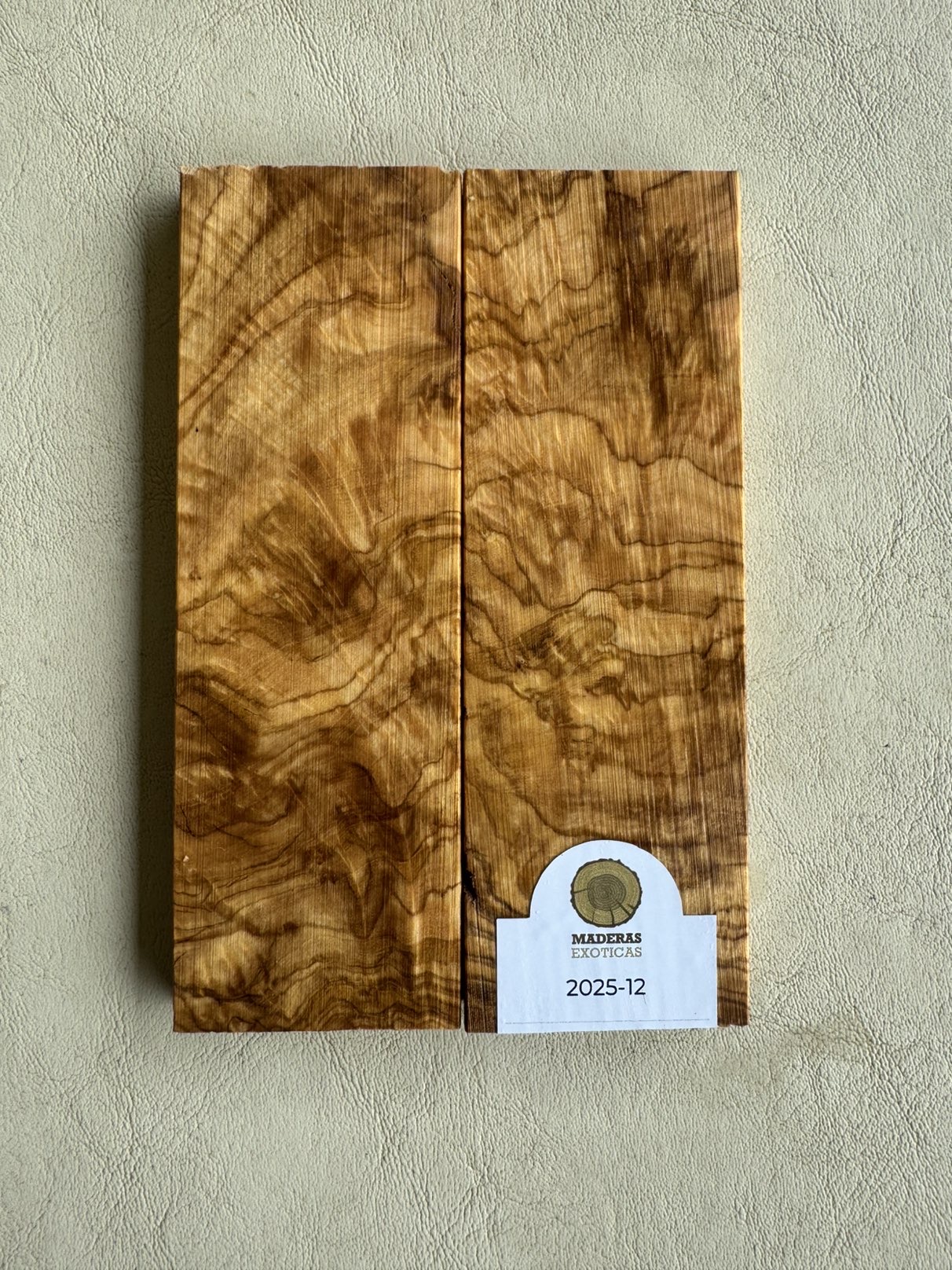 Cachas de olivo (Olea europaea), madera semidura de ± 870 kg/m³. Con veta distintiva, aroma natural y excelente trabajabilidad, es ideal para mangos elegantes, resistentes y con gran valor estético.
