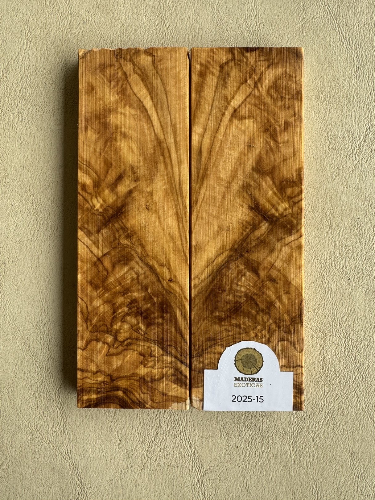 Cachas de olivo (Olea europaea), madera semidura de ± 870 kg/m³. Con veta distintiva, aroma natural y excelente trabajabilidad, es ideal para mangos elegantes, resistentes y con gran valor estético.