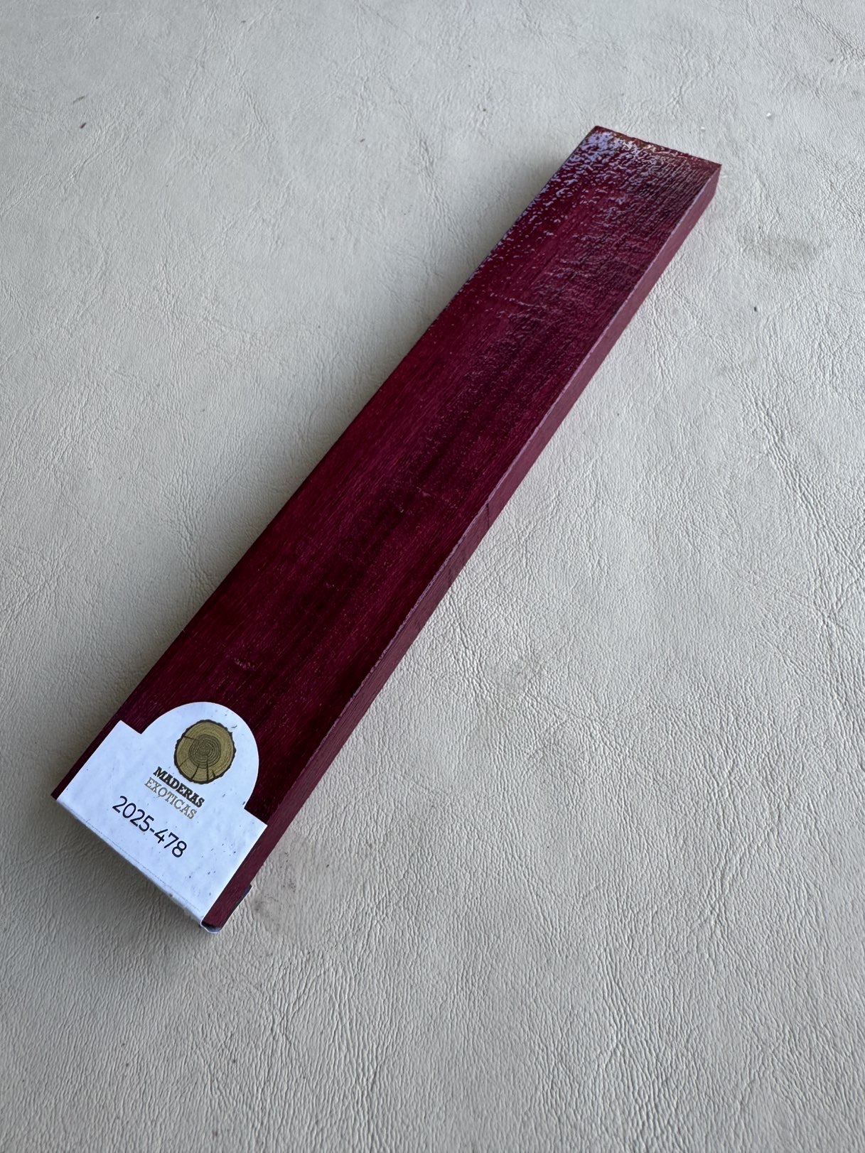 Puentes de Purple Heart (Peltogyne spp.), madera originaria de Centro y Sudamérica, con alta densidad (~850 kg/m³) y excelente estabilidad. Ideal para puentes de guitarra por su dureza, resistencia al desgaste y gran transmisión sonora, aportando sustain definido y ataque claro. Su característico color púrpura, que evoluciona a tonos violáceos profundos con el tiempo, suma un detalle estético distintivo.
