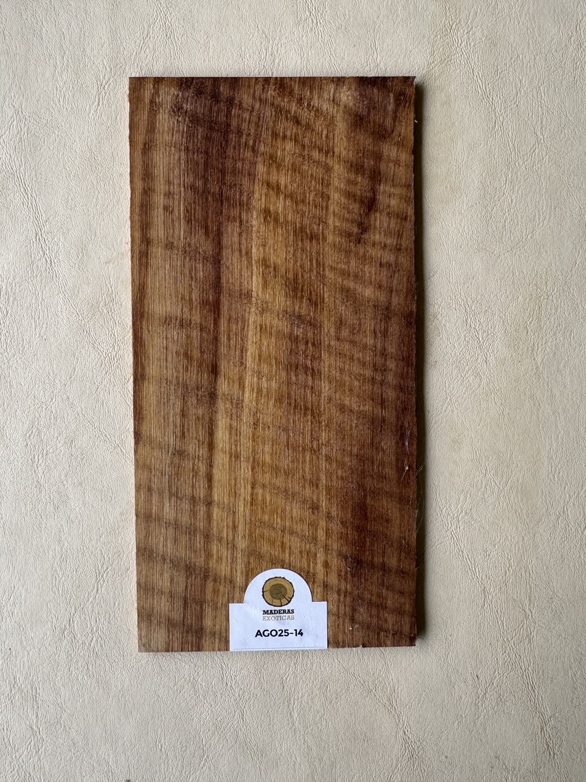 Laurel flameado (Laurus nobilis), madera sudamericana liviana (560 kg/m³) con veta ondulada natural. Ideal para sobrecabezas de guitarras y bajos por su belleza distintiva, buena trabajabilidad y excelente estabilidad. Madera cada vez más valorada por luthiers.