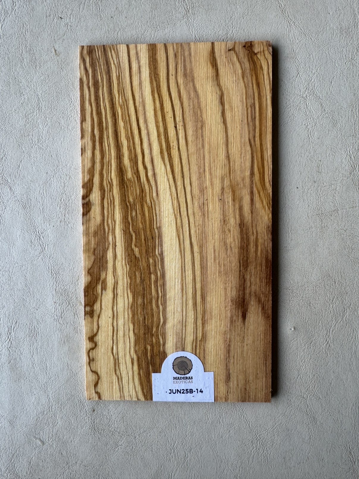 🎸 Sobrecabezas de Olivo para guitarra — Olea europaea, originaria de la región mediterránea. Con una densidad promedio de 850 kg/m³, esta madera dura y estable ofrece vetas únicas, con tonos dorados, marrones y oliváceos que elevan cualquier proyecto de luthería. Perfecta para sobrecabezas con carácter y estilo.