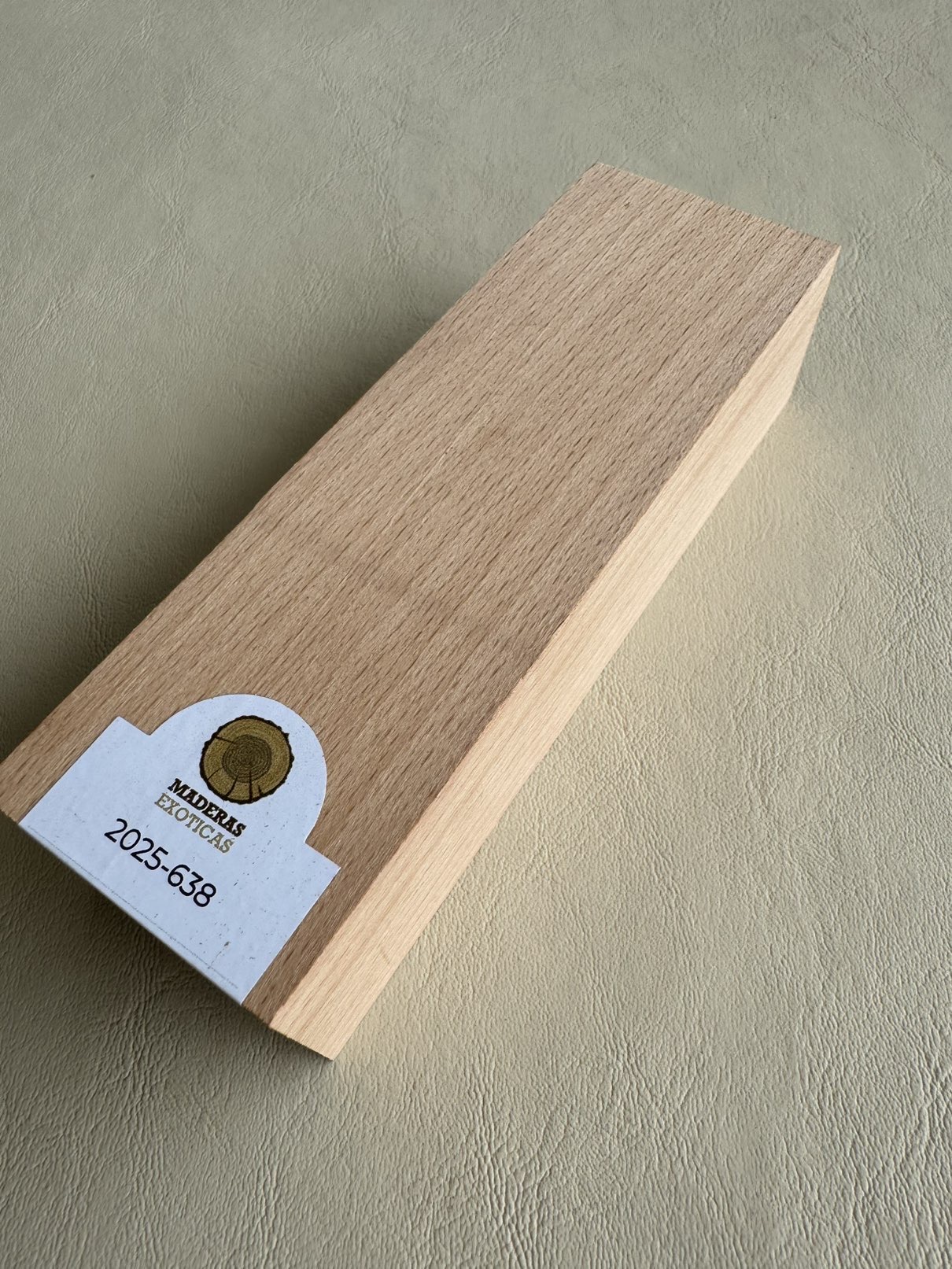 🔪 Tacos Haya (Fagus sylvatica) para cuchillería, de origen europeo. Con una densidad de aprox. 720 kg/m³, esta madera se destaca por su dureza, resistencia al impacto y facilidad de trabajo, logrando terminaciones finas y duraderas. Ideal para mangos de cuchillos de alta calidad, combina estabilidad dimensional con una textura uniforme que realza el pulido.