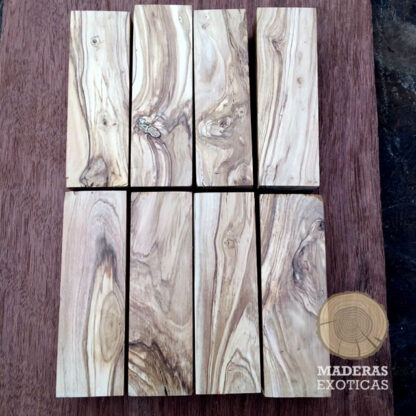 Los tacos de Olivo (Olea europaea) son una elección premium para cuchillería artesanal por su belleza natural, estabilidad y durabilidad. Originaria de la región mediterránea, esta madera destaca por su dibujo de veta único, con tonos que van del amarillo dorado al marrón con vetas oscuras y contrastadas, creando piezas exclusivas. Con una densidad aproximada de 900 kg/m³, el olivo es compacto, resistente y fácil de pulir, ofreciendo un acabado liso y cálido al tacto. Ideal para cachas de cuchillos de alta gama por su elegancia, dureza y carácter distintivo.