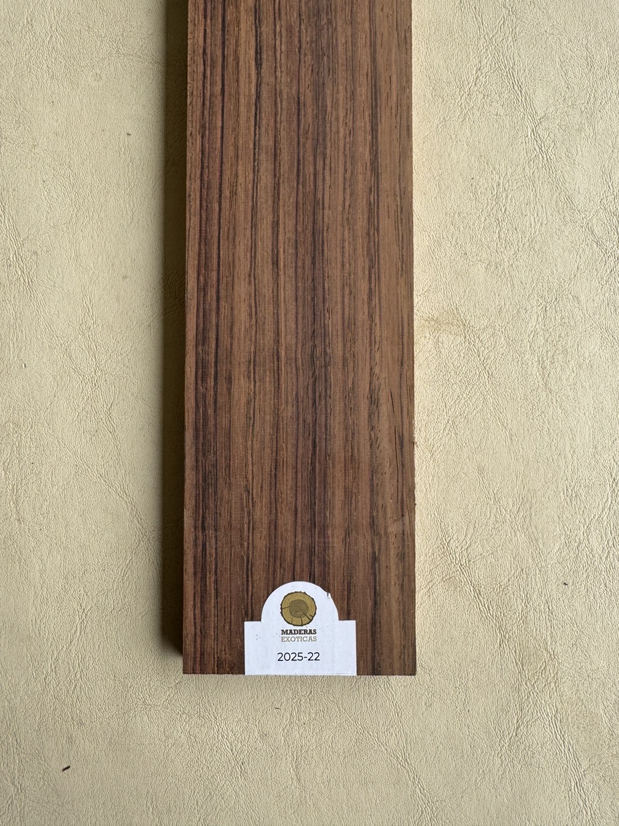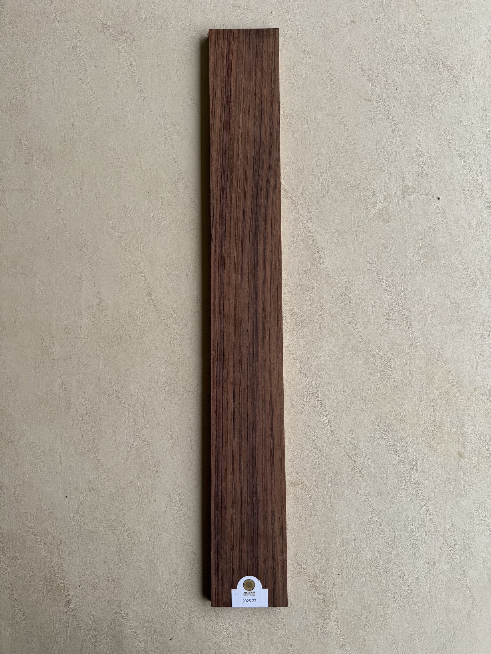 Diapasones de Brazilian Rosewood (Dalbergia nigra), originarios de Brasil. Con una densidad elevada (1.050–1.200 kg/m³), esta madera ofrece calidez tonal, gran durabilidad, estabilidad sobresaliente y una estética elegante con vetas oscuras profundas, ideal para guitarras de alta gama.