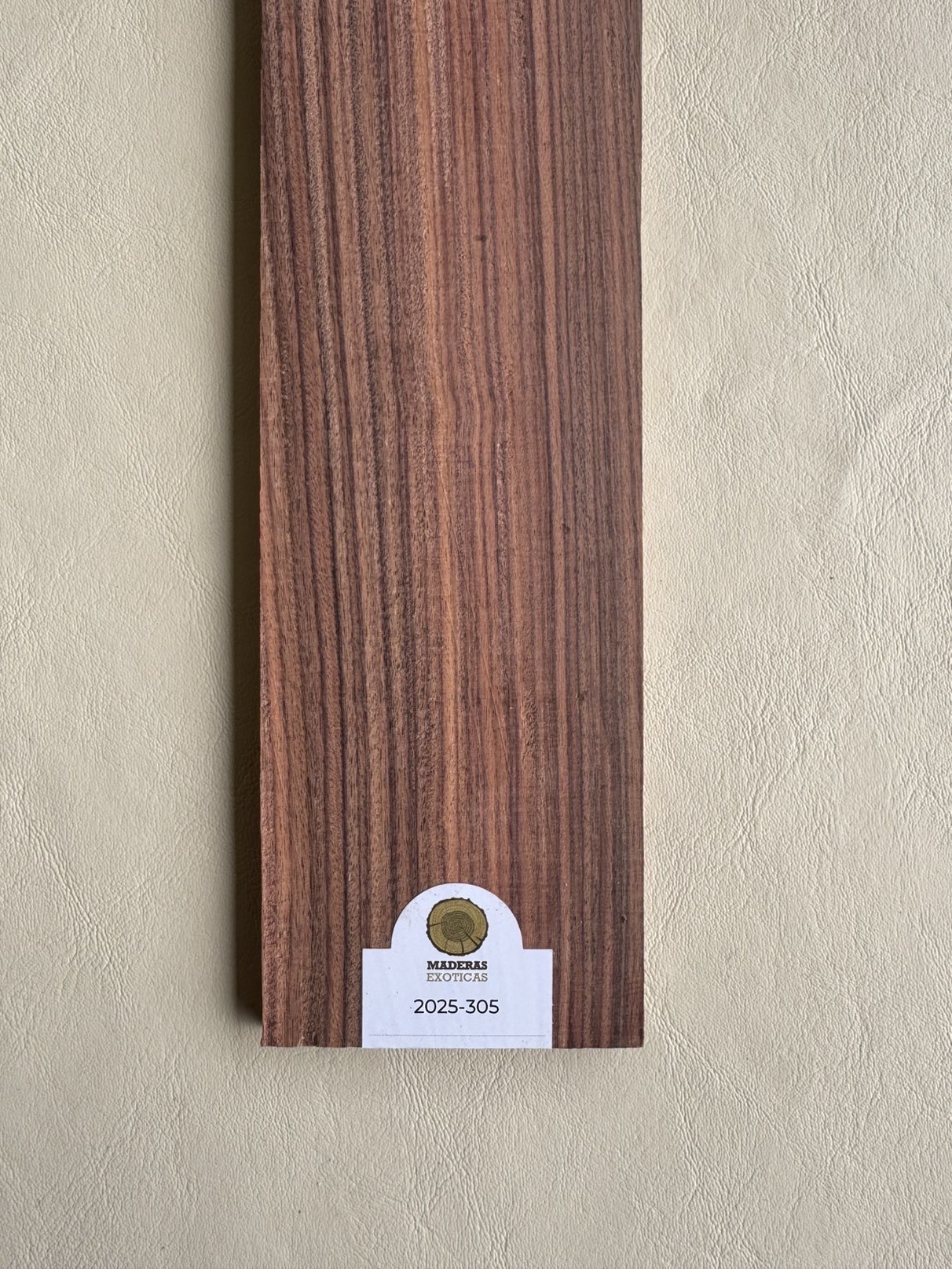 Su belleza natural destaca por vetas irregulares que van del marrón dorado al púrpura oscuro, aportando una estética única a cada instrumento. Excelente para diapasones, fondos, aros y tapas armónicas en guitarras acústicas, clásicas o eléctricas.