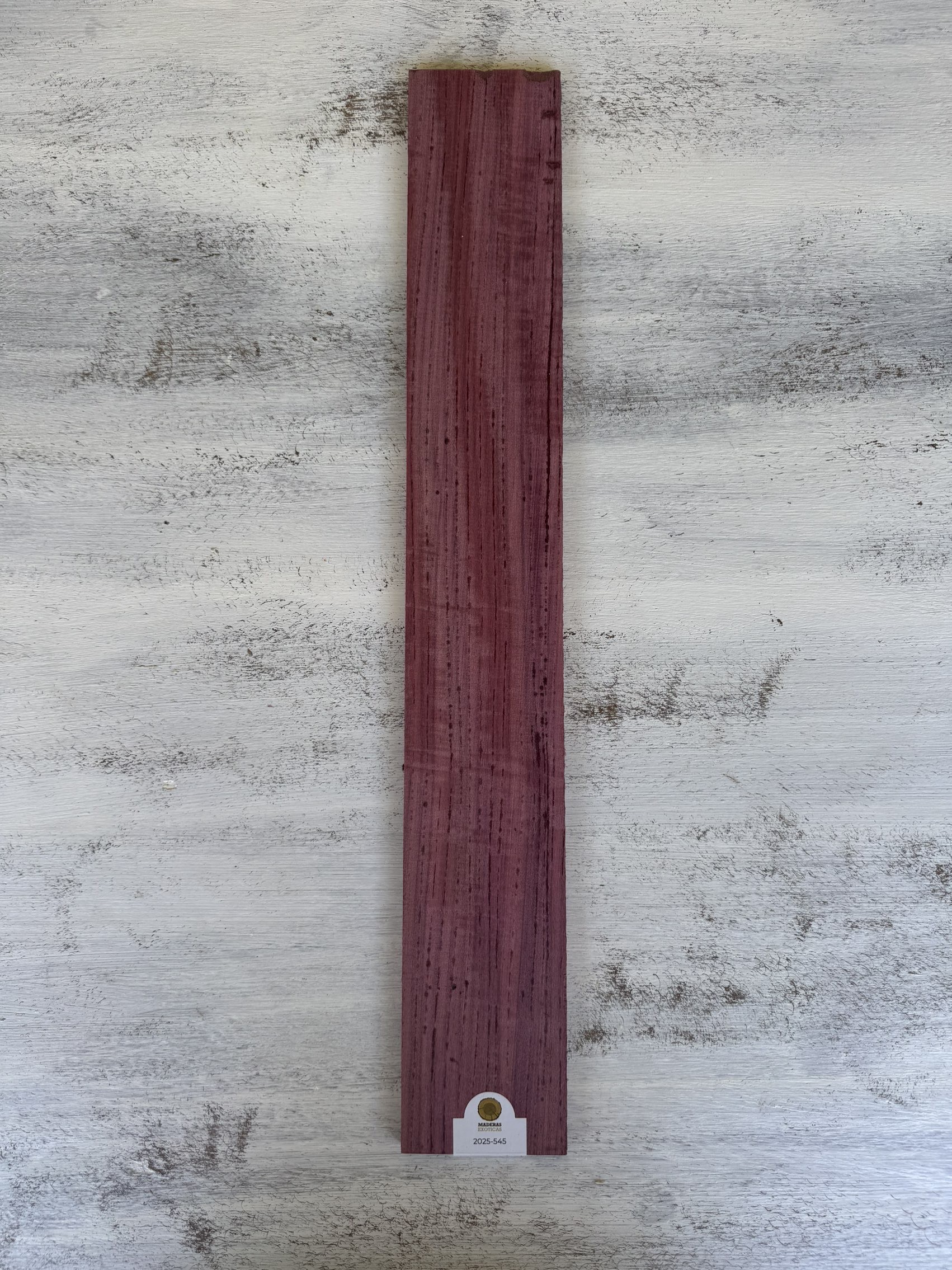 Diapasones de Purpleheart (Peltogyne spp.), madera sudamericana de color violeta intenso, con alta densidad (850–950 kg/m³) y gran dureza. Ofrece excelente sustain, estabilidad y una estética única para guitarras de alto nivel.